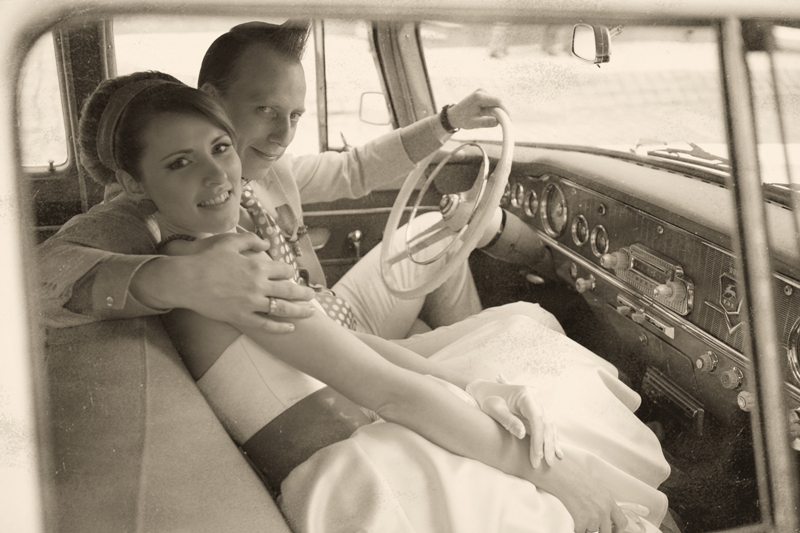 Все вещи, детали и люди, которые окружали нас в тот день, были в том же стиле: пригласительные, наша одежда, прически, макияж, ресторан, друзья, и даже машина тех годов!